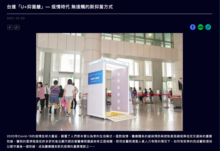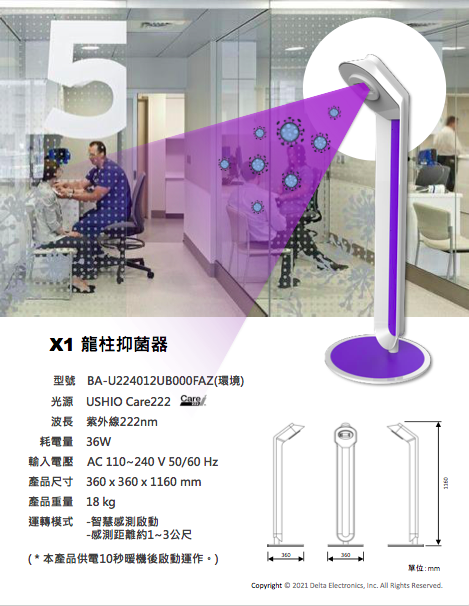 台達電子為全球電源管理及散熱解決方案的領導廠商,採用日本USHIO在台獨家授權的Care222®技術,做為最佳紫外線抑菌方案,開發各種應用產品,非接觸、不殘留,比酒精效果更佳,同時抑制物體表面及空氣中的病毒,經證實對於COVID-19有顯著抑菌作用,又不具傳統254nm波長紫外線的危險性,在日常生活中達到更全面的防疫效果。